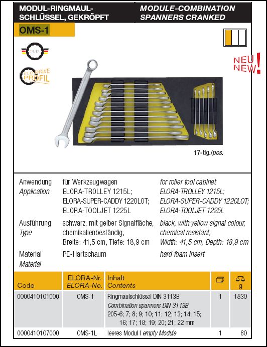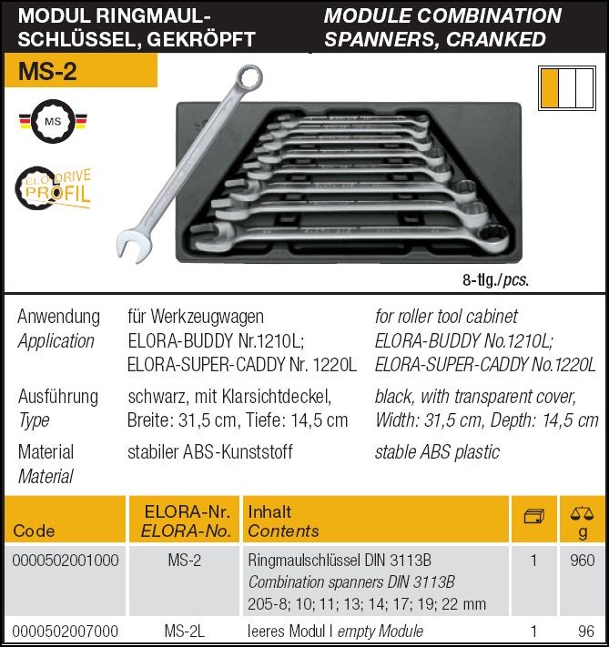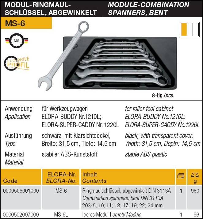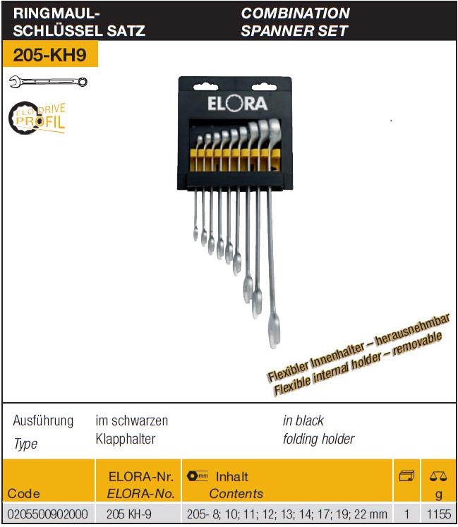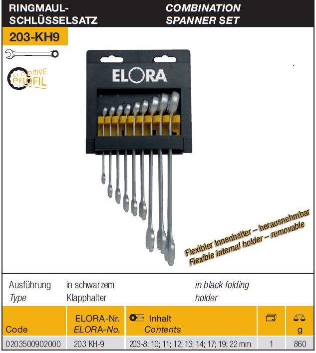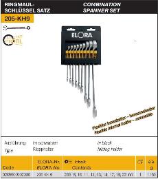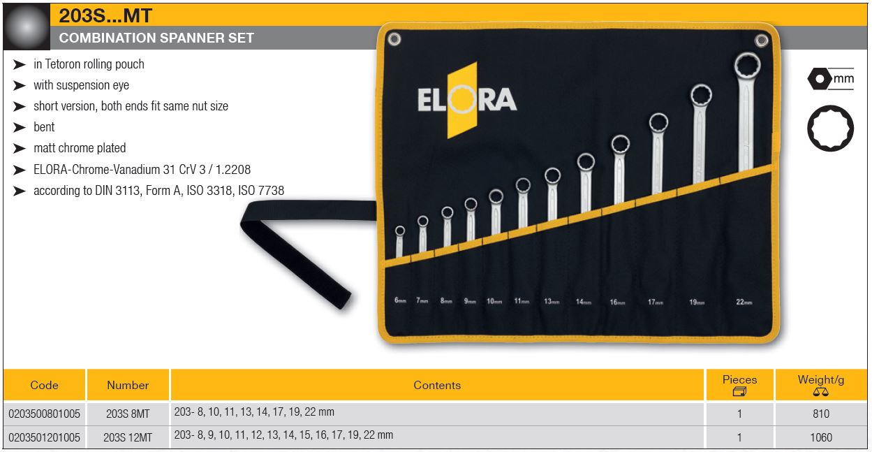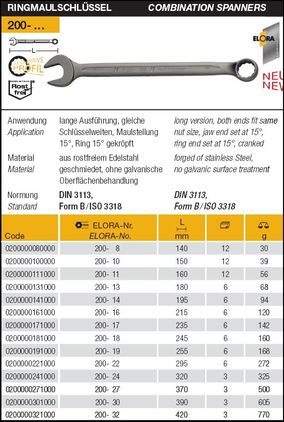 | Elora  Combination Spanners are made according to DIN 3113, B/ISO 3318. They are constructed of Chrome Vanadium 31 CrV 3, Code No. 1.2208. All sizes. Made in Germany. |