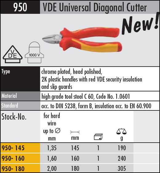 950VDE-145 Insulated Diagonal side cutters 145mm long $ 51.10 |
