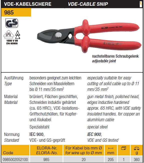 985-205 VDE CableCutters For cutting Copper & Aluminum cable up to 20mm. $ 141.01 |