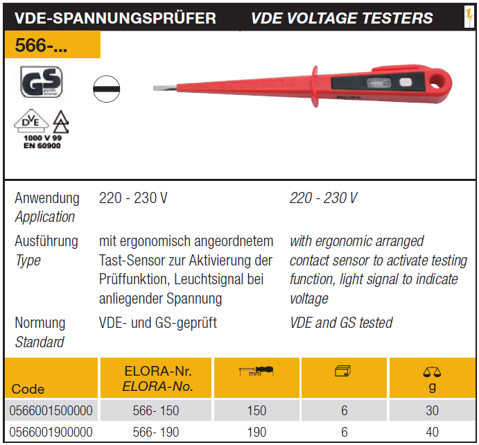 | 566-190 Elora VDE Electric Pocket Tester 190mm $ 4.80 |