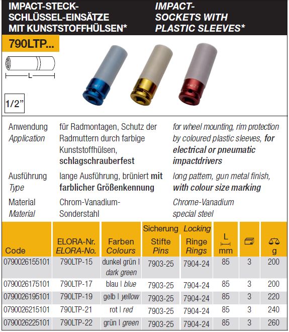 | 790-LTP S3 Plastic impact socket set, 1/2" drive. Contains 17, 19, and 21mm sockets. $ 70.63 |
